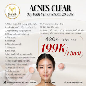 Liệu trình Acnes Clear 20 bước chuẩn y khoa giúp làm sạch sâu, hút nhân mụn, giảm viêm và ngừa mụn quay lại.